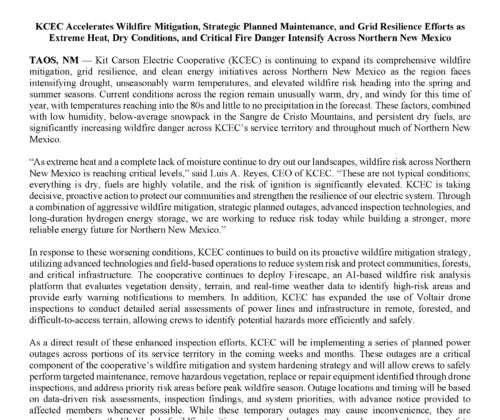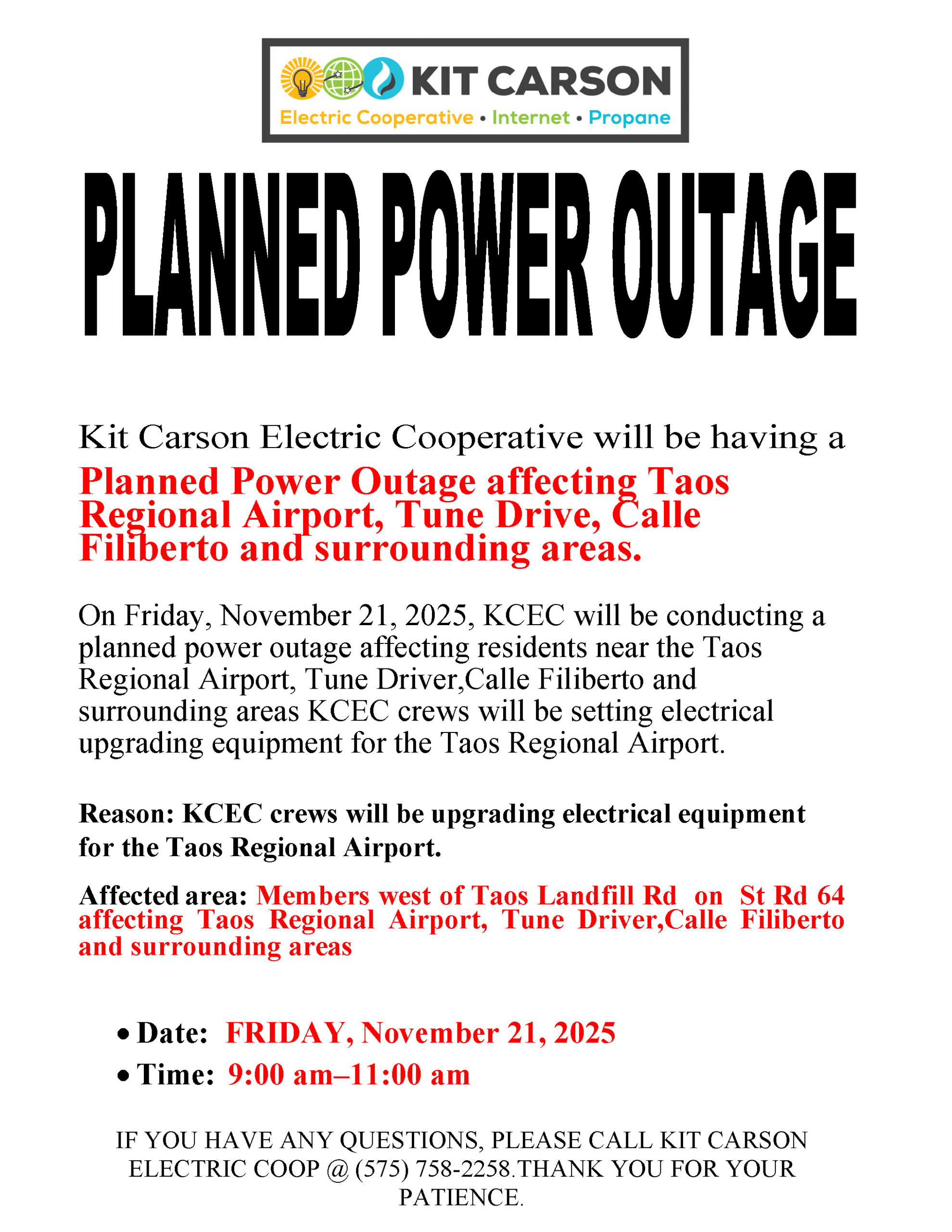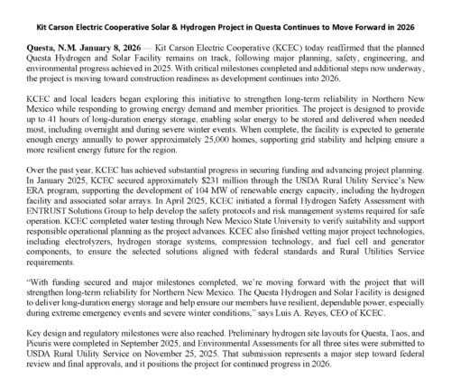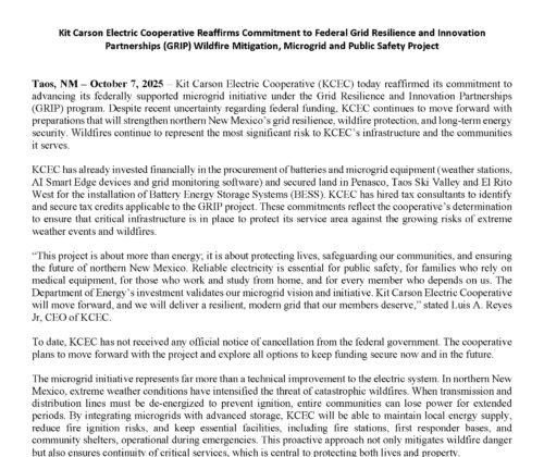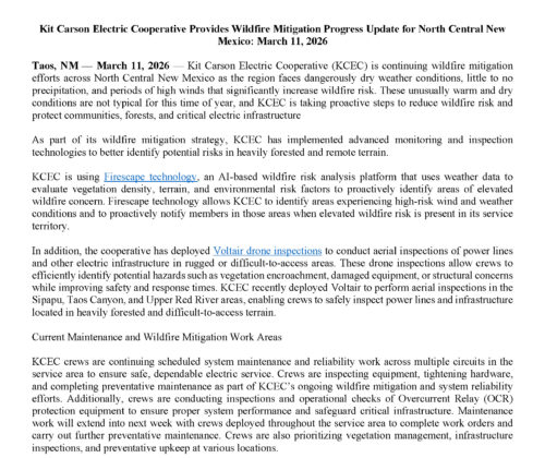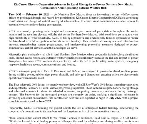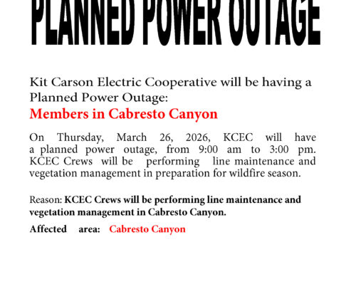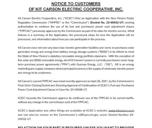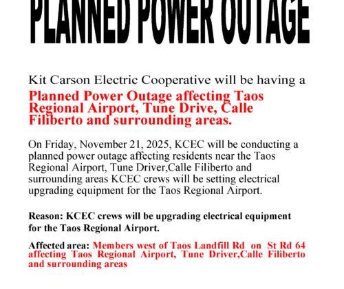 Kit Carson Electric Cooperative (KCEC) is a member-owned Electric Distribution Cooperative serving Taos, Colfax and Rio Arriba Counties since 1944. For the past seventy-five years, KCEC has been providing electricity to its over 29,000 members. Through employment opportunities, KCEC, its division – Kit Carson Internet and its subsidiary – Kit Carson Energy, Inc., the coop supports approximately 125 families.