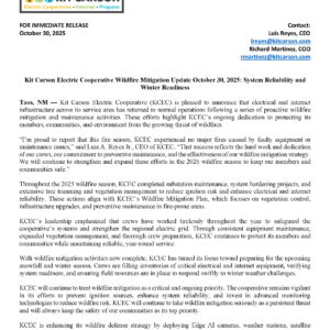 Read more >Kit Carson Electric Cooperative will be conducting planned power outages to complete vegetation management and safety system maintenance ahead of the winter season. These efforts are critical to ensure reliable power and safe operations as crews face limited access in many areas. 🗓 Schedule of Outages (9:00 AM – 3:...