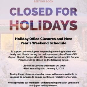 Read more >Kit Carson Electric (KCEC) will perform a pole-top training exercise in the Ranchos area on September 21, 2023. KCEC is conducting a safety mayday call to prepare and train our linemen and operations for emergencies. THIS IS JUST A TRAINING EXERCISE. First responders and emergency services will be in the Ranchos area. The exercise is sch...