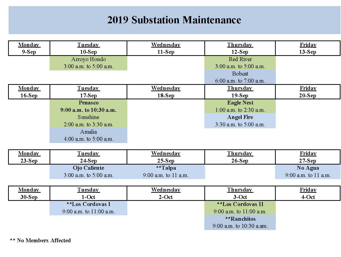 The following is a schedule of dates, times and affected areas for performing the maintenance on the corresponding substations. These are part of the series of planned outages for the preventive maintenance project for 2019.