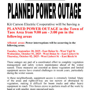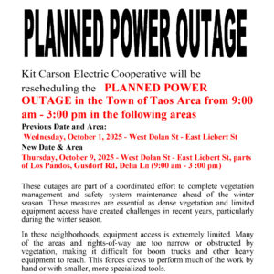 Kit Carson Electric Cooperative will be rescheduling the Planned Power Outage in the Town of Taos Area. 📅 New Date & Area:Thursday, October 9, 2025🕘 9:00 am – 3:00 pm📍 West Dolan St – East Liebert St, parts of Los Pandos, Gusdorf Rd, and Delia Ln ❌ Previous Date & Area (canceled):Wednesday, Oct...