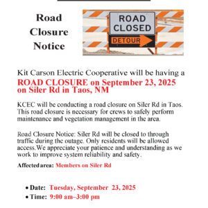 Road Closure Notice – Siler Rd, Taos, NM Organizer: Kit Carson Electric CooperativeReason: Crews will be performing system maintenance and vegetation management to improve reliability and safety. Power and Internet services will not be affected unless troubleshooting arises. Key Details Date: Tuesday, September 23, 2025 ...