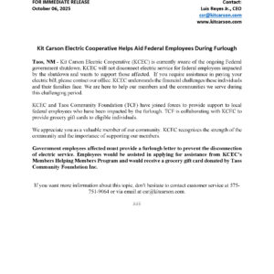 Taos, NM – During these trying times Kit Carson Electric Cooperative, Inc. (KCEC) will assist federal employees who are separated from employment. KCEC understands the financial obligations of federal employees during this difficult time. We are here to help our members and the communities we serve. KCEC will not disconnect electric...